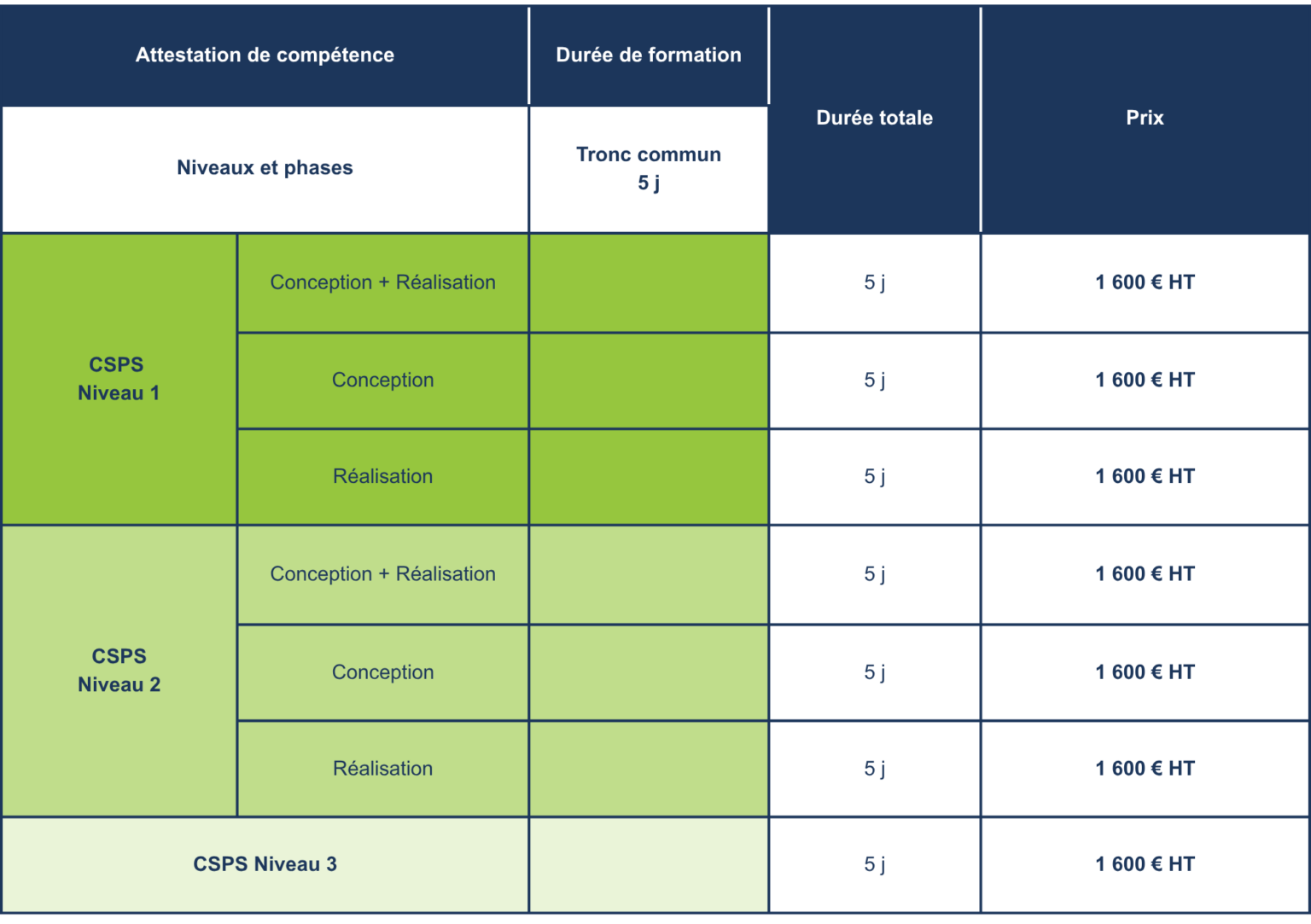 D’une durée de 5 jours, la formation permet à l’issue d’un contrôle continue et d’une évaluation finale des connaissances, d’obtenir une attestation d’actualisation des compétences CSPS, valable 5 ans (attestation de la formation spécifique).